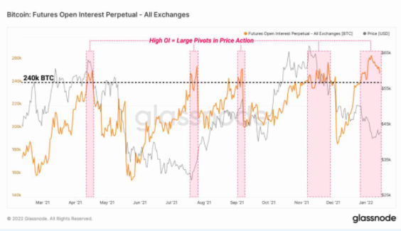 Açık pozisyonların toplam değerinin 250.000 BTC’den yüksek olması, Glassnode verilerine göre daha önce hep yüksek volatilite yarattı.