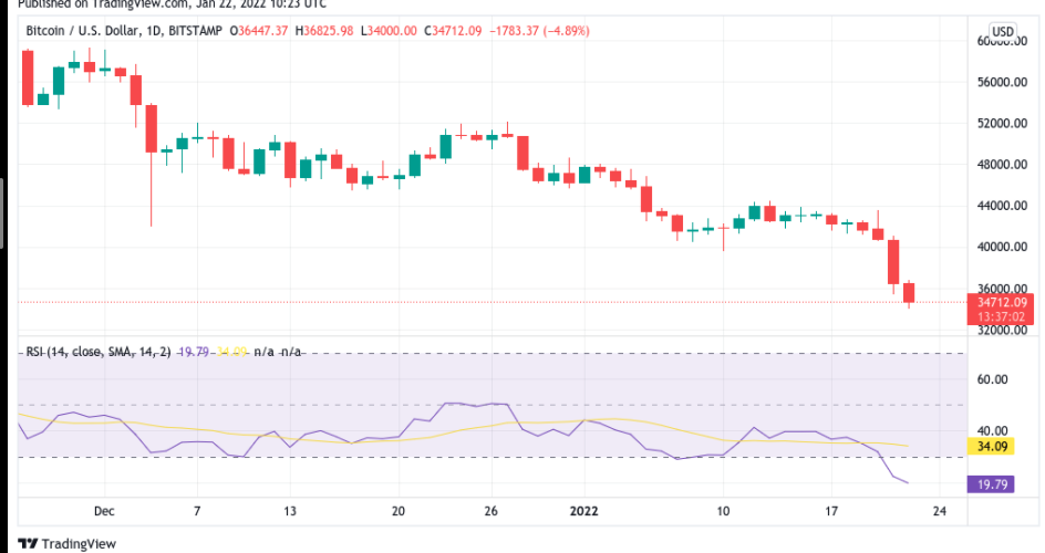 Lider kripto para birimi Bitcoin (BTC), 20 Ocak gecesinde başlayan düşüşünü hızlandırarak ve şiddetlendirerek sürdürüyor. 40.000 dolar desteğini kaybeden BTC bugün ise 34.008 dolara kadar geriledi ve Mart 2020’den beri görülmeyen bir sinyal kendini belli etti.