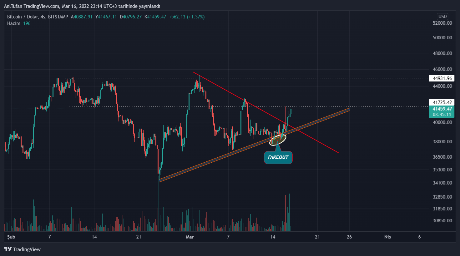 Yukarı yönlü bir fakeout hareketi daha yapmaması halinde yükseliş yaşayacak olan Bitcoin, kısa süre içerisinde 41.700 dolar direncine tekrar ulaşabilir.