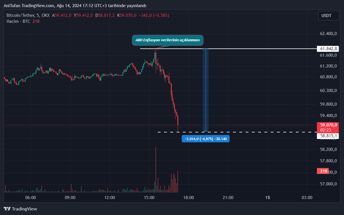 Şimdilik 58.800 dolardan tepki alıp 59 bin doların üzerinde tutunmaya çalışan BTC, 59 bin doların altında kalıcı olması halinde çok daha ani geri çekilmeler yaşayabilir.