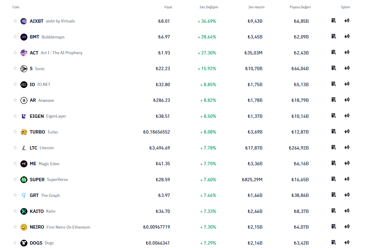 AIXBT’nin yanı sıra ise BMT, ACT ve S‘nin de %10’dan fazla artış yaşadığı görüldü. Ayrıca IO, AR, EIGEN ve TURBO‘da günün en çok kazandıranları listesinde yer aldı.
