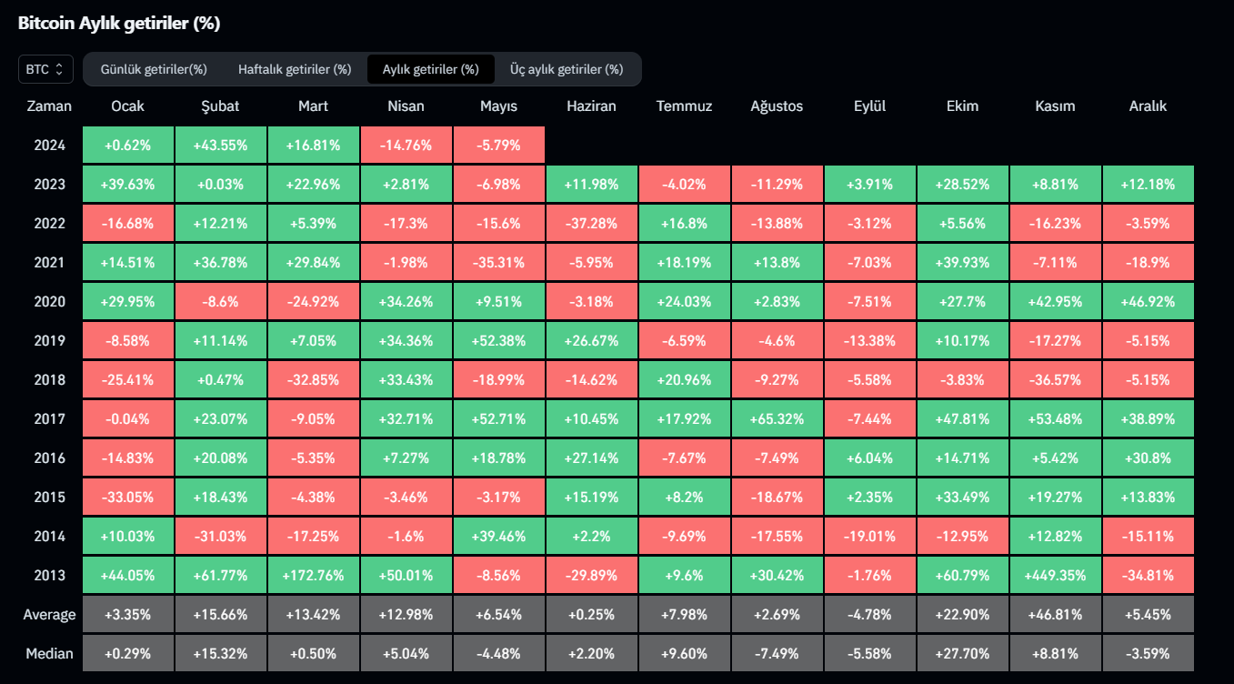 Tarihsel verileri incelediğimizde Bitcoin’in 2021, 2022 ve 2023 mayıs aylarında kayda değer düşüşler yaşadığı görülüyor. Bu sefer ise nisan ayında çöküş yaşanmasından ötürü mayıs ayında bir toparlanma görebiliriz.