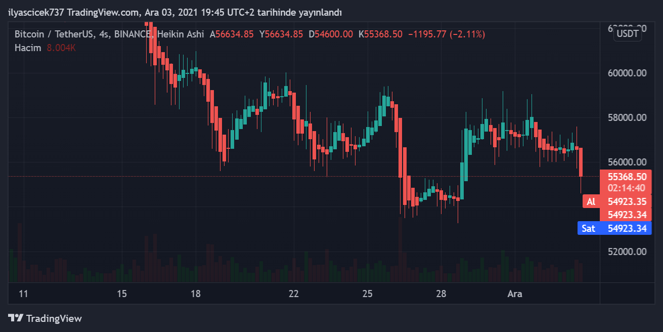 Bitcoin’in 4 saatlik grafiğine baktığımızda aşırı satış baskısının oluştuğunu ve ayıların BTC fiyatını 53.500 dolar seviyesine indirmek için baskı yaptığı görülüyor. Bununla birlikte boğaların, Bitcoin üzerindeki hakimiyetini hala koruduğu gözlemleniyor.