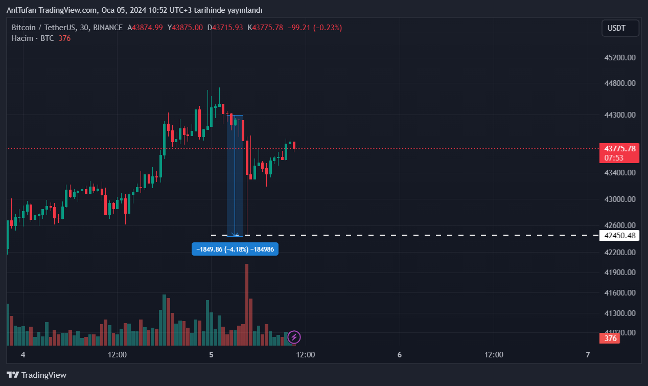 Bitcoin gece TSİ 04.00 – 05.00 sularında ani bir düşüş yaşadı. 42.450 dolara gerileyen BTC, altcoin‘leri de fazlasıyla kötü etkiledi.