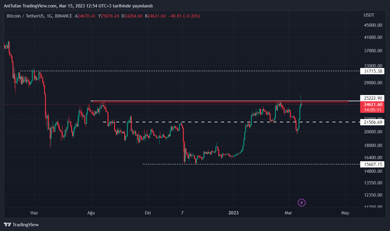 2022 yılının haziran ayından bu yana 25.200 dolar seviyesinin altında kalan BTC, her ne kadar dün itibariyle bu seviyeyi aşmış olsa da, günlük kapanışı 24.600 dolar seviyelerinde gerçekleştirdi.