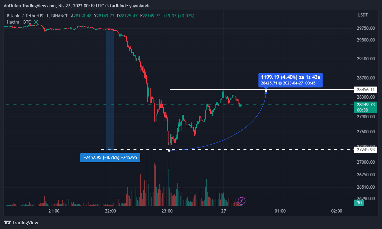 Şuan itibariyle yüzde 8’lik düşüşün ardından yüzde 4 oranında değer kazanarak 28.500 dolar seviyelerine yükselen BTC, yatırımcıların “BTC geri mi dönüyor?” şeklinde düşünmelerini sağladı.