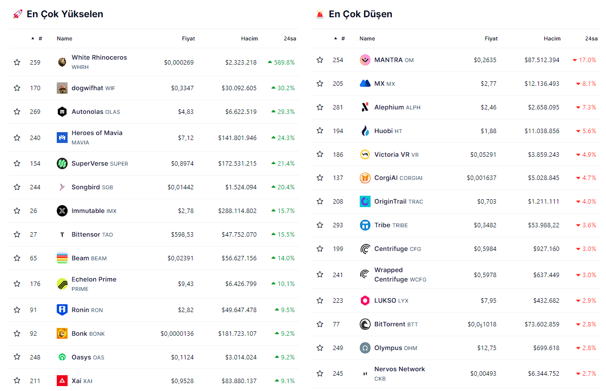 Hadi gelin altcoin’lerin son 24 saat içerisinde performanslarına birlikte göz atalım: