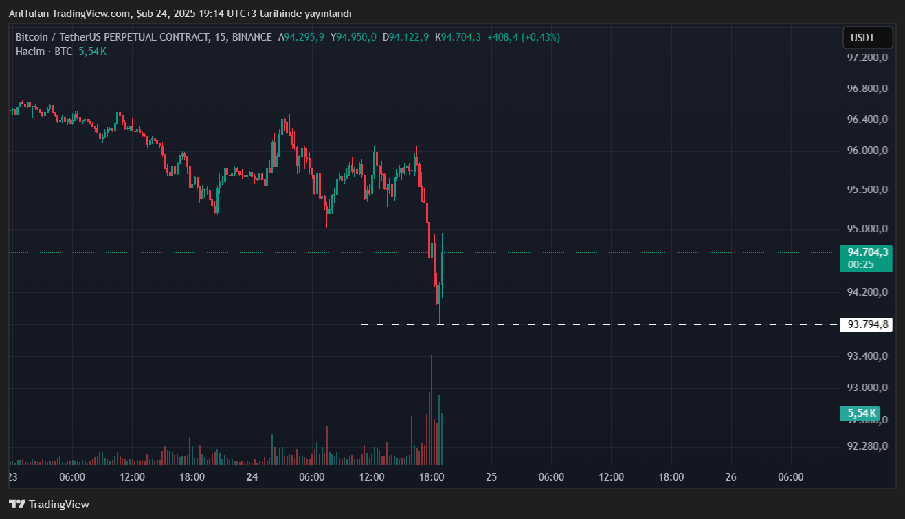 Geçtiğimiz dakikalarda Bitcoin’deki (BTC) satış baskısı ciddi miktarda yükseldi. Bu baskı sonucunda BTC’nin 93.794 dolar seviyelerine kadar gerilediği gözlemlendi.