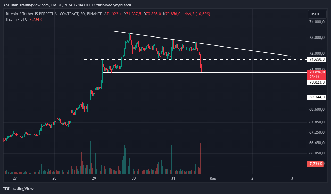 Bu satış baskısı sonucunda bir süredir üzerinde kaldığı 71.650 dolar desteğini de kaybeden BTC, 70.800 dolar desteğine kadar bir düşüş yaşadı.