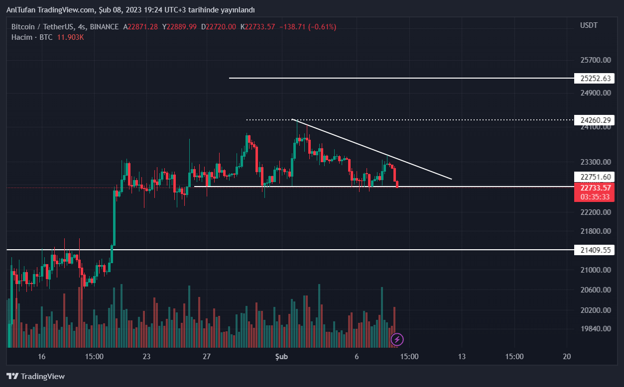 Bitcoin 25 Ocak tarihinden beri 22.750 dolar destek seviyesinin altında 4 saatlik kapanış yapmadı. Her düşüş dalgasında bu destek noktasından tepki alan BTC, şuan itibariyle kritik dakikalar yaşıyor gibi gözükmekte.