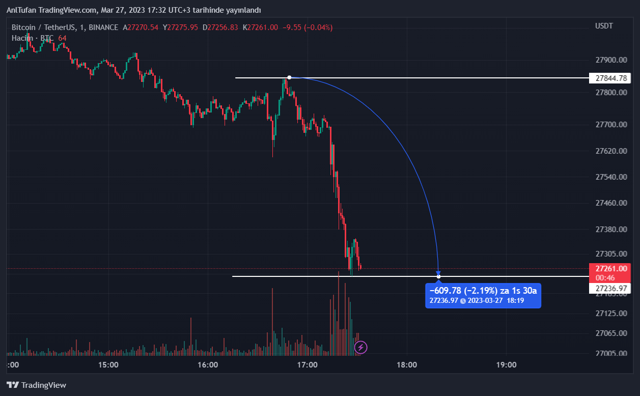 27.850 dolar seviyelerinden 27.200 dolara kadar yüzde 2’den fazla değer kaybeden BTC, ilerleyen saatlerde 27 bin doların altına sarkması halinde çok daha büyük düşüşler yaşayabilir gibi gözükmekte.