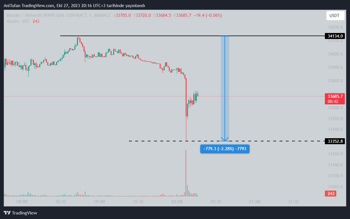 Sadece 1 dakika içerisinde 33.822 dolardan 33.352 doları gören Bitcoin, long pozisyon açan yatırımcıları likit etmiş gibi gözükmekte.