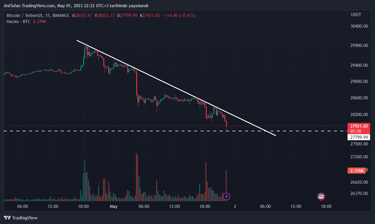 İlerleyen saatlerde Bitcoin’in 27.800 dolar desteğini de kaybetmesi, düşüşlerin hızlanmasına neden olacaktır. Bu destekten ufak bir tepki alan BTC, minor düşen trendini yukarı yönlü kırması halinde yükselişe geçebilir.