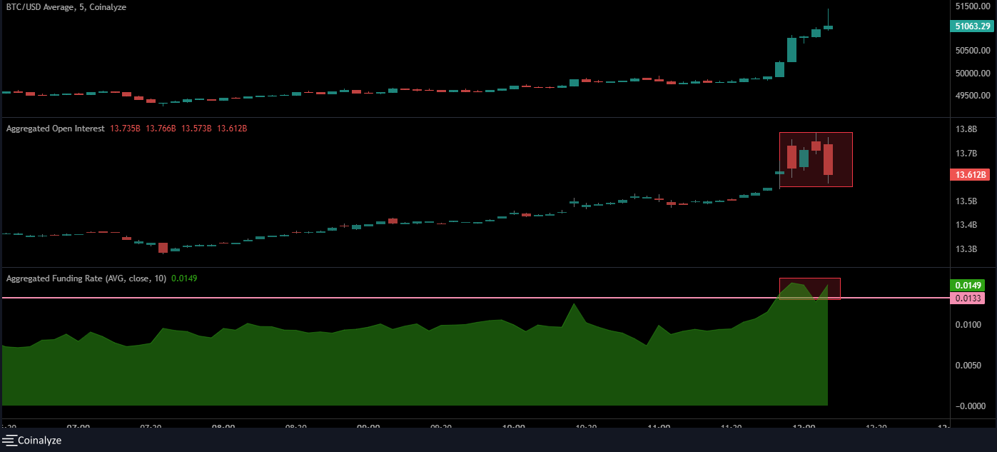 Son 30 dakika özelinde Binance vadeli piyasada 49.800 dolar seviyelerinden 51.750 dolara kadar yükselen BTC, %4 oranında değer kazanmayı başardı. BTC spot piyasada ise 51.400 doları gördü.