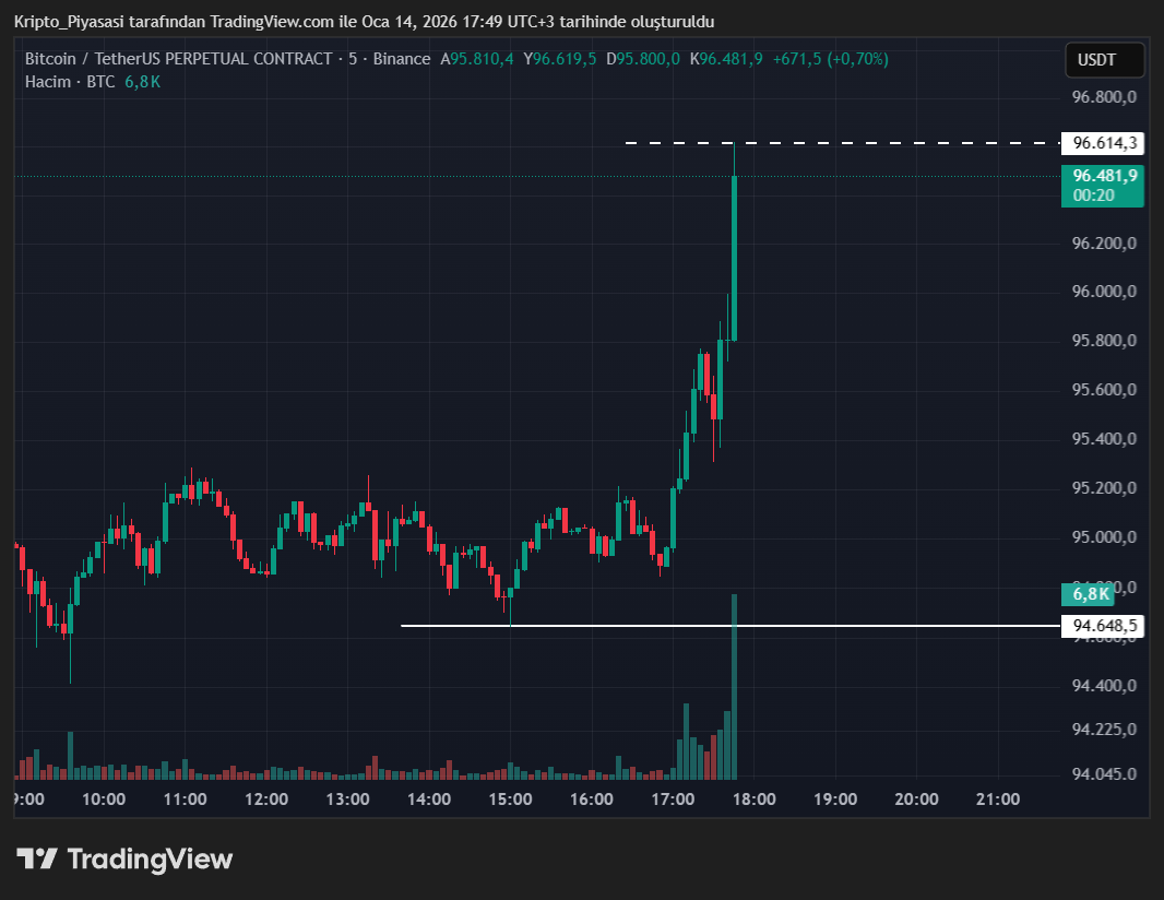 Bitcoin her ne kadar dün 96.500 dolara kadar yükselip sonradan düşüş yaşamış olsa da, 94.400 dolar seviyelerinde dip yapmayı başardı. BTC son dakikalarda tekrardan yükselişe geçerek yeniden 96.600 dolar seviyesini gördü.