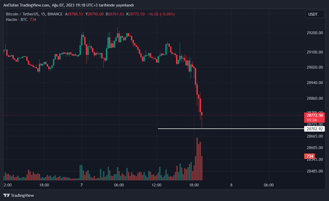 Son dakikalarda yaşadığı düşüşler ile birlikte 28.700 dolara gerileyen BTC, şimdilik düşüş trendini sonlandıracak gibi gözükmekte.