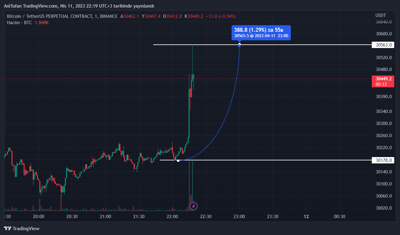 Geçtiğimiz dakikalarda bir anda yukarı yönlü bir kırılım gerçekleştiren BTC, çok kısa bir süre içerisinde 30.150 dolar seviyelerinden 30.550 dolara kadar yükseldi.