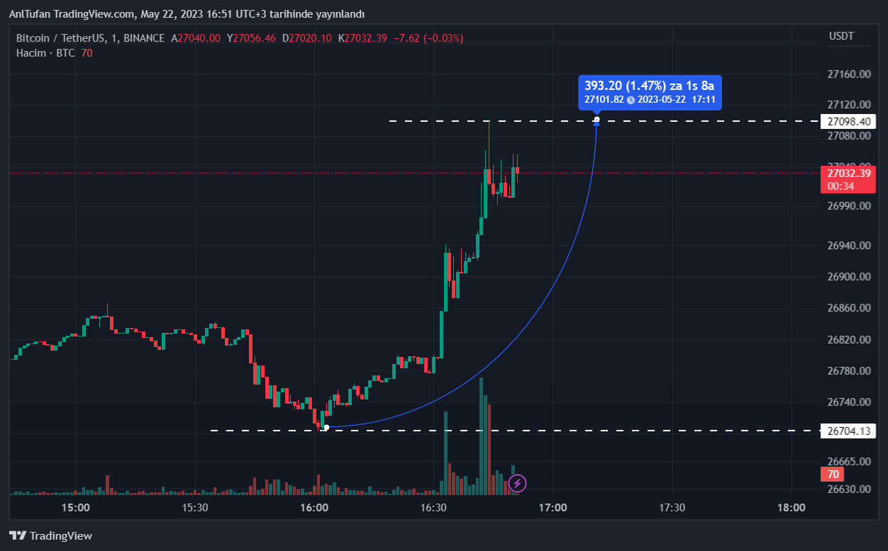 Çok kısa bir süre içerisinde yüzde 1.47’lik bir artış gerçekleştiren BTC, ilerleyen saatlerde Biden ile McCarthy arasında gerçekleştirilecek görüşmeden olumlu bir haber gelmesi halinde çok daha büyük yükselişler yaşayabilir.