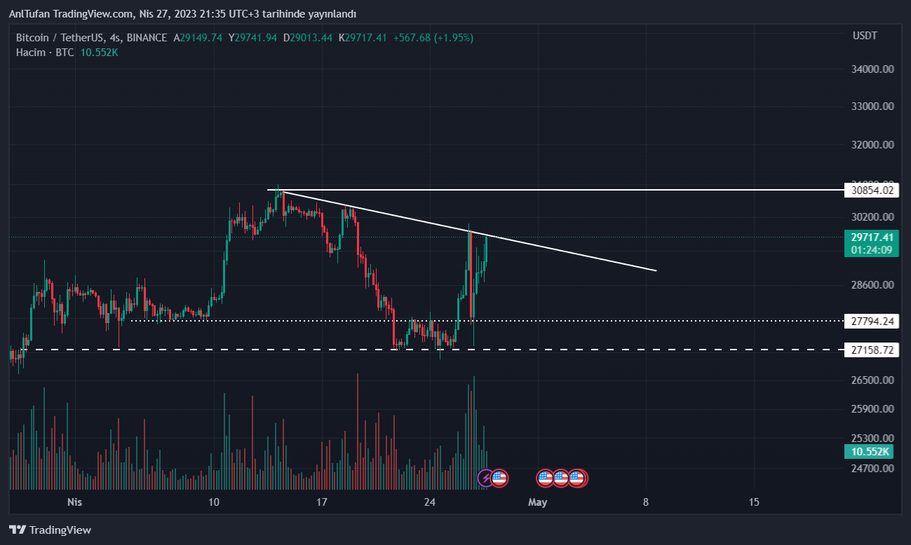 Dün gece itibariyle minor düşen trend seviyesi 29.850 dolar seviyelerinden reddedilen BTC, şuan itibariyle bu düşen trend direnç noktasına yeniden yükselmeyi başarmış durumda. İlerleyen saatlerde ise Bitcoin’deki hareketlerin çok daha volatil olacağı tahmin ediliyor.