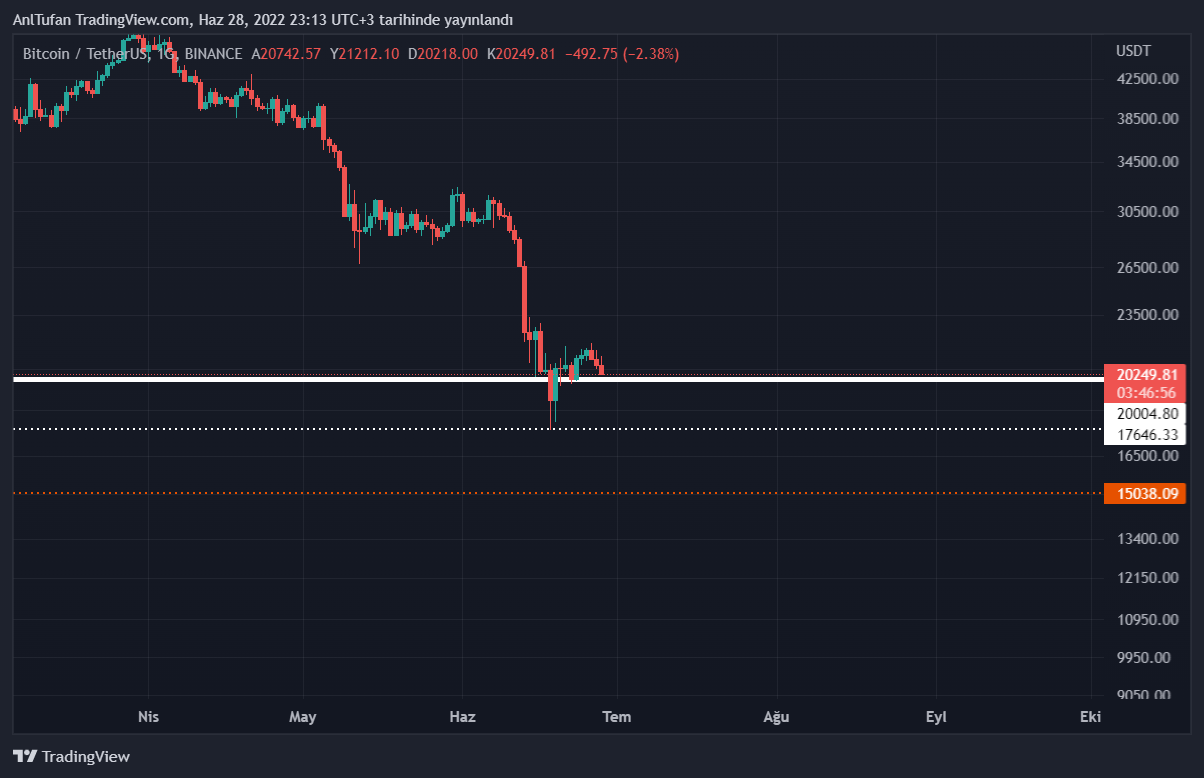 Lider kripto para birimi olan Bitcoin ilerleyen saatlerde 20 bin dolar desteğinin altına sarkması halinde son dip seviyesi olan 17.800 dolara kadar düşüş yaşaması oldukça olası olarak görülmekte.