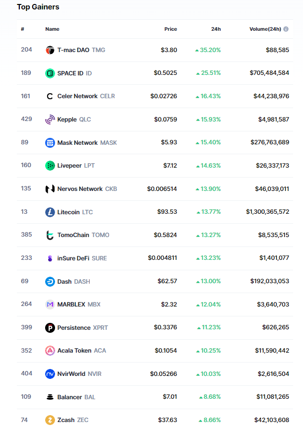 Piyasa değeri sıralamasına göre 204. sırada yer alan TMG, bugün özelinde yüzde 35 oranında değer kazanarak yatırımcıların ilgisini üzerine çekmiş durumda. TMG haricinde aşağıdaki altcoin’lerde kayda değer yükselişler yaşadı: