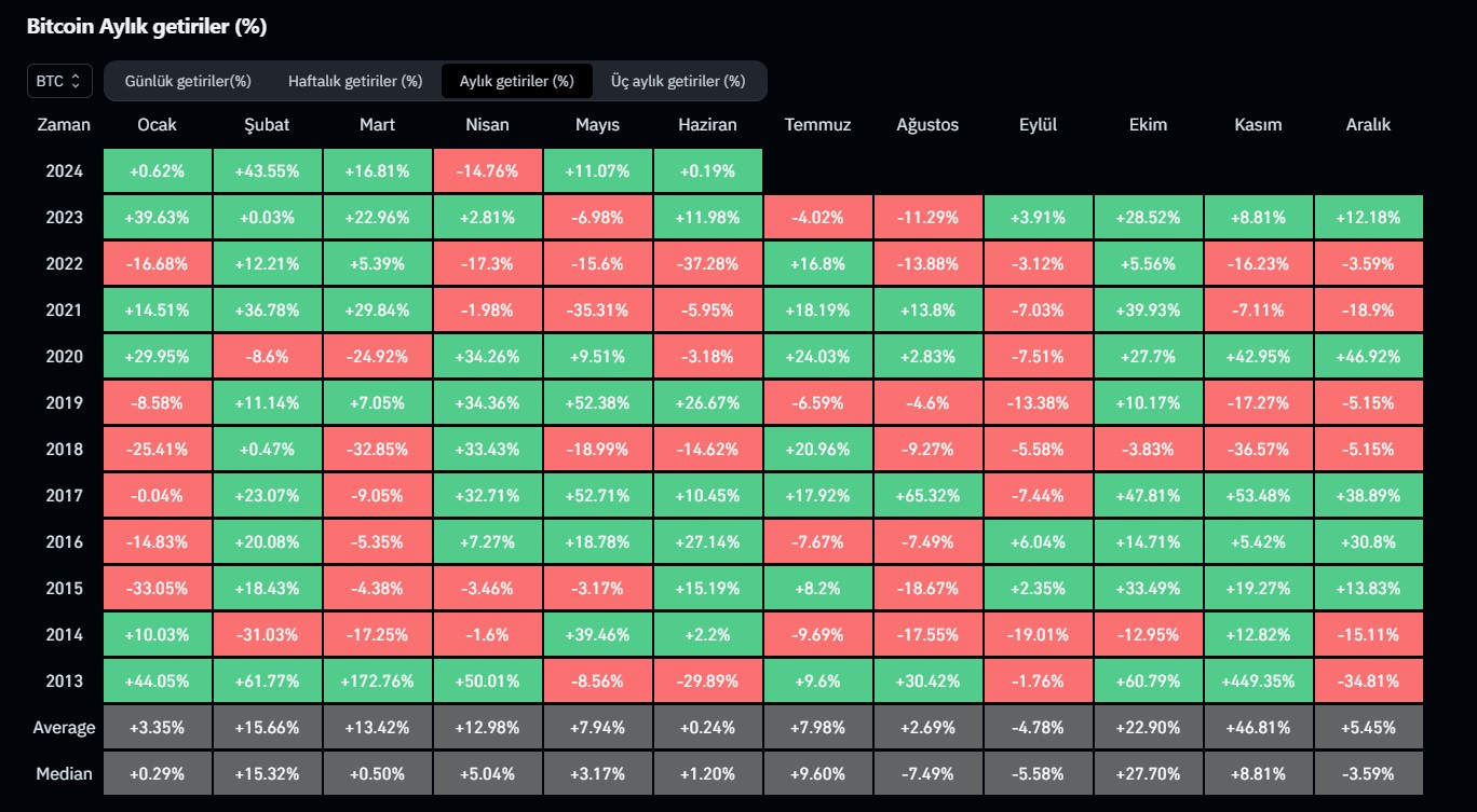 Tarihsel verilere göre önümüzdeki temmuz ayı özelinde Bitcoin’de sert düşüşlerin yaşanması çok olası durmuyor. BTC son 7 temmuz ayının 5 tanesinde değer kazandı.