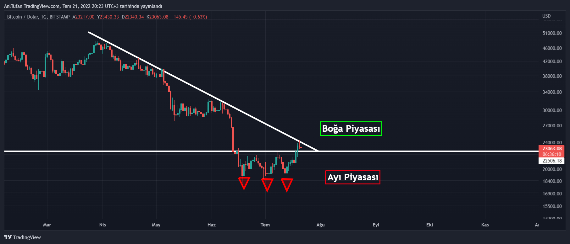 Bugün itibariyle 200 haftalık hareketli ortalamaya ve major bir yatay destek seviyesi olan 22.500 dolara kadar gerileyen BTC, bu seviyelerden güzel bir tepki alarak tekrardan 23 bin doları aşmayı başardı.