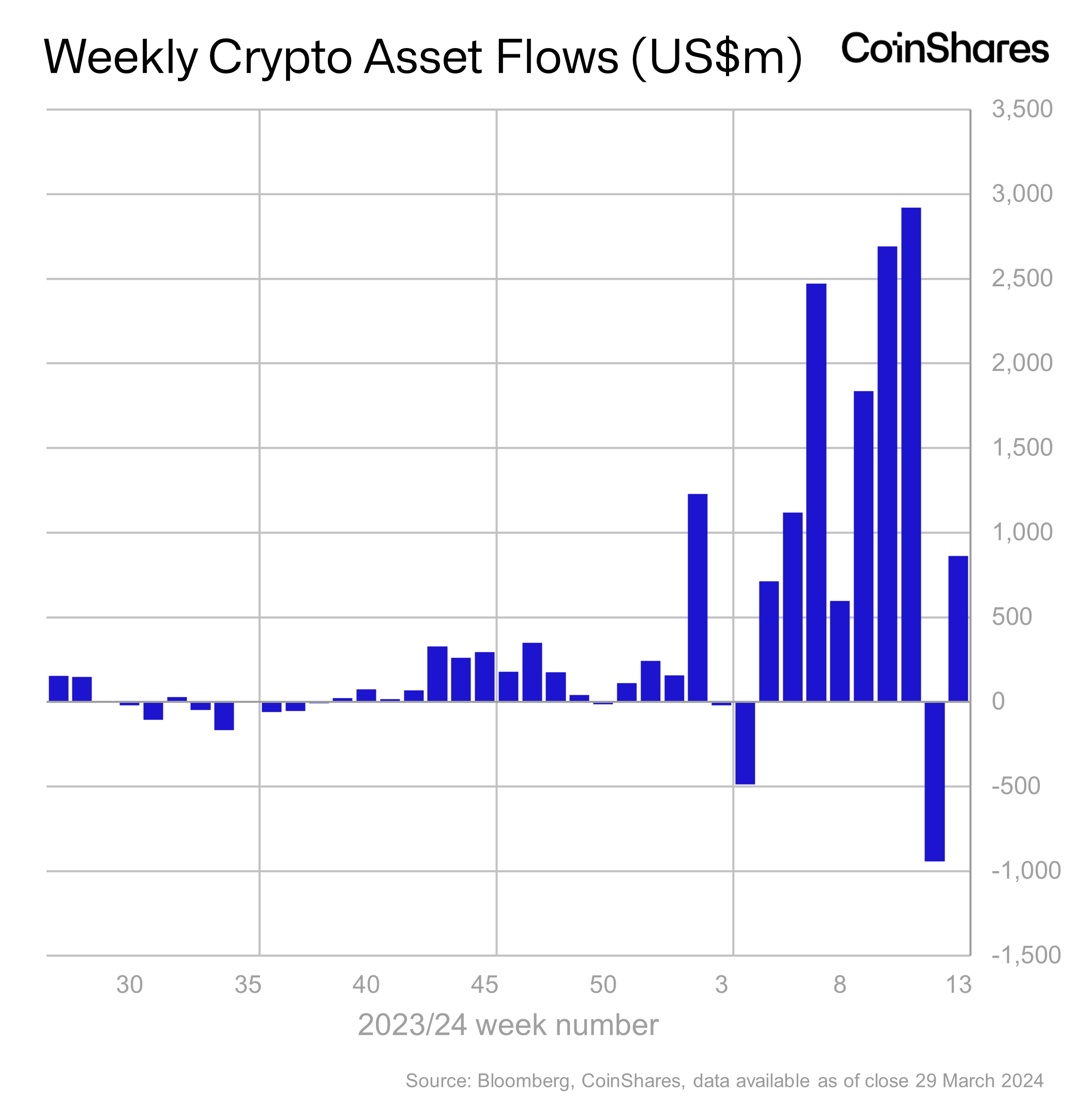 Aktarılanlara göre kripto varlık fonlarına geçtiğimiz haftada toplamda 862 milyon dolarlık bir para girişi oldu. Bu girişin büyük bir kısmının lider kripto para birimi Bitcoin‘e (BTC) olması yatırımcıları şaşırtmadı.