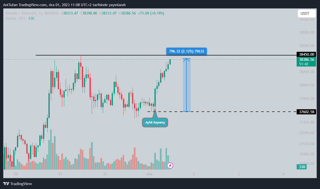 Bitcoin aralık ayının başlamasıyla birlikte sadece 1 tane saatlik mumu kırmızı olarak kapattı. Sürekli bir şekilde yükselen BTC, %2’den fazla değer kazanarak 38.500 dolar direncine çok yaklaştı.