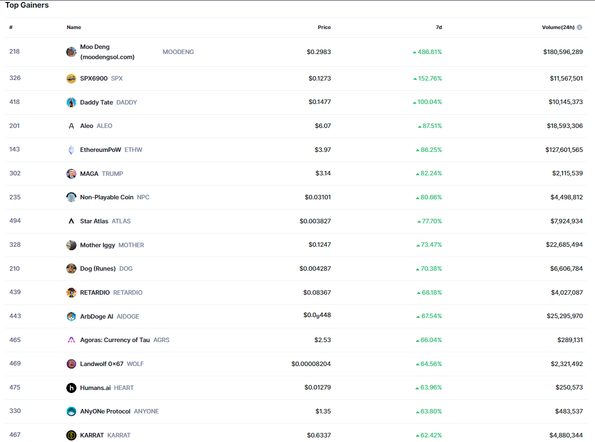 MOODENG’in SPX, DADDY, ALEO, ETHW, TRUMP ve NPC‘nin de %80’den fazla değer kazandığı görüldü.