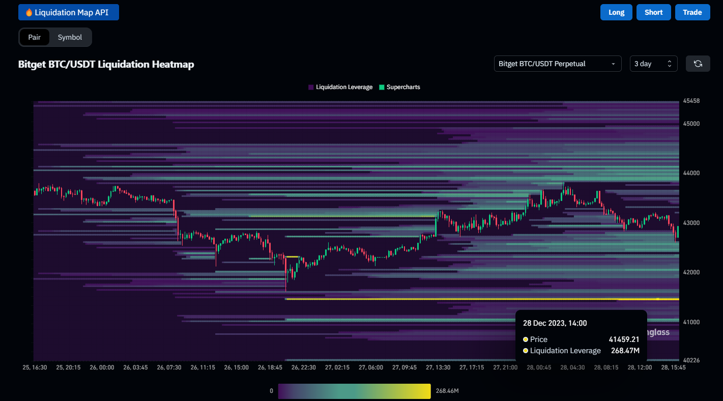 Başarılı bir veri sağlayıcısı olan CoinGlass’ın likidasyon haritasını incelediğimizde, 41.450 dolar seviyesinde 268 milyon dolarlık bir long likidasyonunun biriktiği görülüyor.