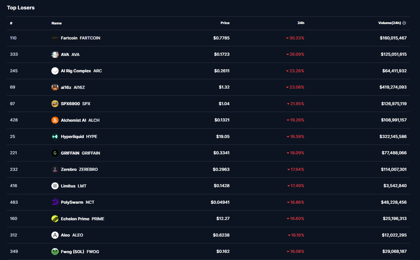 FARTCOIN’in yanı sıra AVA, ARC, AI16Z, SPX ve ALCH‘ın da %20’den fazla değer kaybettikleri gözlenmekte.