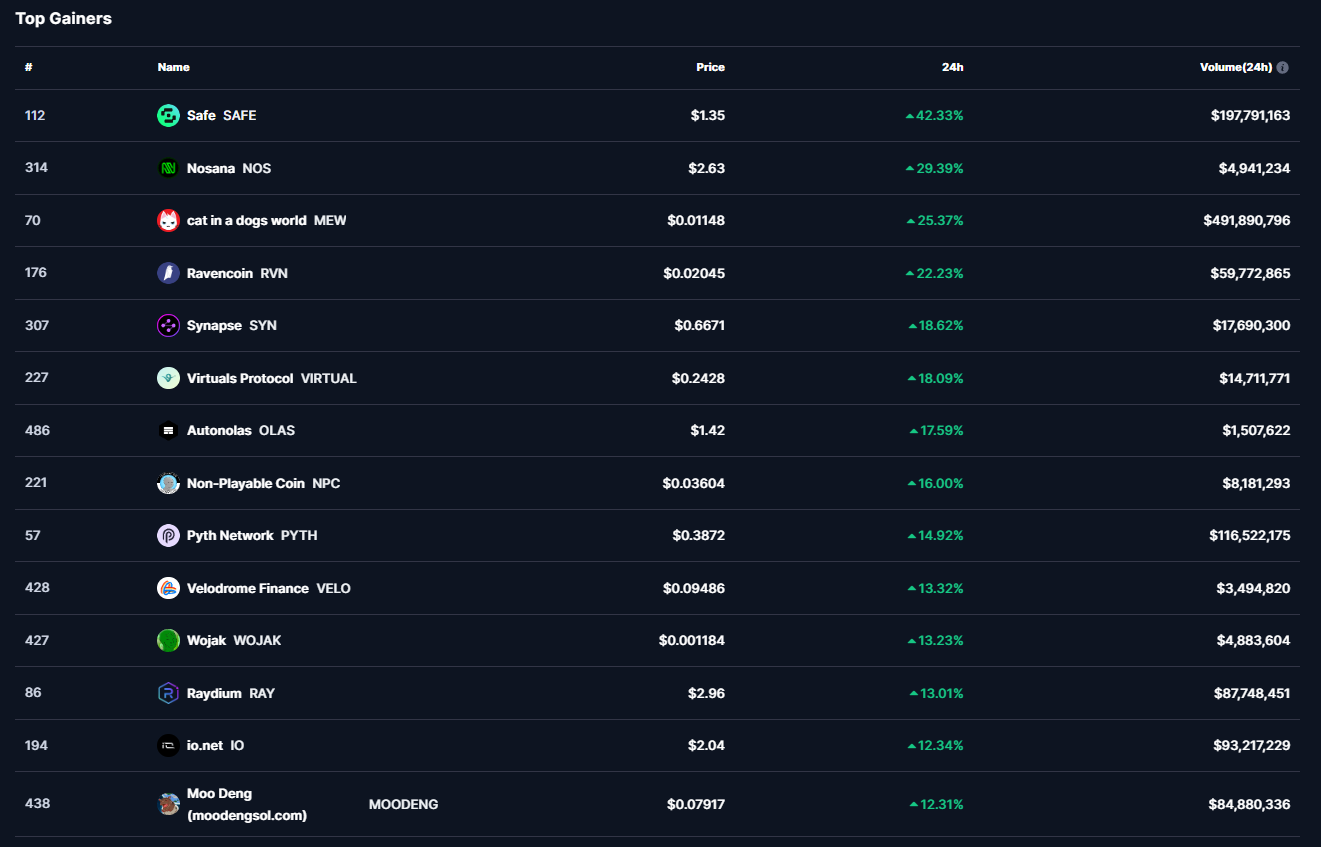 Başarılı veri sağlayıcısı CoinMarketCap’in aktardıklarına göre ilk 500 kripto para birimi içerisinde son 24 saat özelinde en çok artışı %42 ile birlikte SAFE isimli altcoin gerçekleştirdi. SAFE bugün itibariyle Upbit borsasında listelenmişti