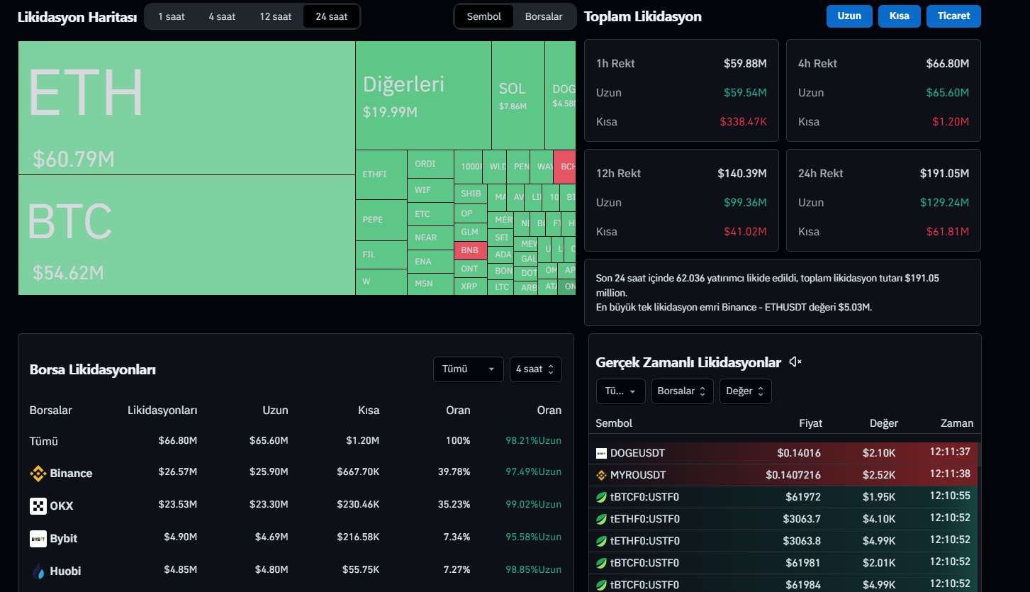 Başarılı bir veri sağlayıcısı olan CoinGlass’ın aktardıklarına göre bugün itibariyle yaşanan sert düşüşlere rağmen sadece 191 milyon dolarlık pozisyon likit edilmiş durumda. Bu pozisyonların 129 milyon dolarlık kısmının long, 61 milyon dolarlık kısmının ise short olduğu görülüyor.