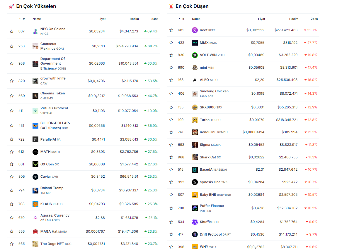 Hadi gelin bugünün en çok artan ve düşen altcoin’lerine birlikte göz atalım: