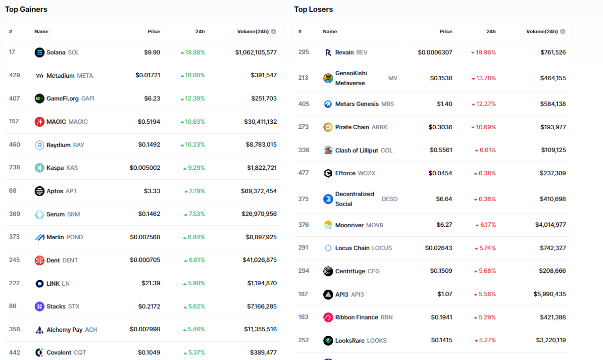 Son 24 saat içerisinde yüzde 18 oranında değer kazanan Solana, tekrardan yaşam sinyalleri vermeye başladı. En büyük düşüşü ise yüzde 20 ile Revain‘in (REV) gerçekleştirdiği gözlenmekte.
