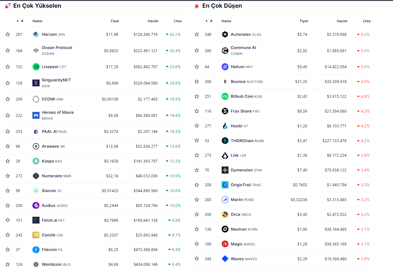 Hadi gelin hafta sonu özelinde en çok artan ve düşen altcoin’lere birlikte göz atalım: