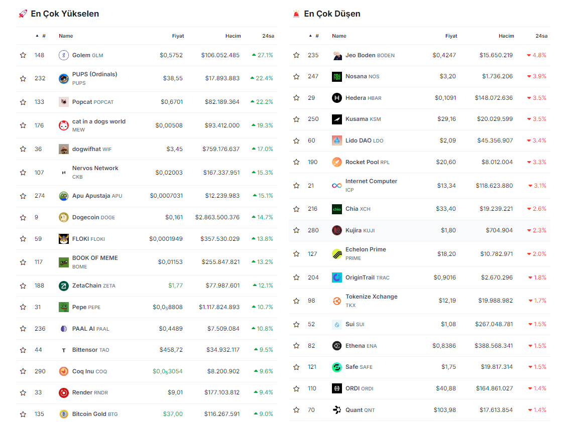 Hadi gelin altcoin’lerin son 24 saat içerisindeki performanslarına birlikte göz atalım:
