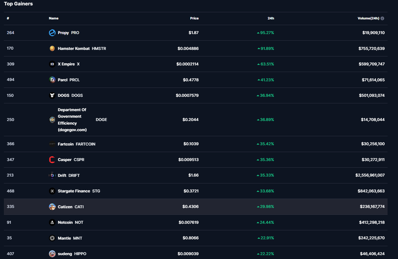 PRO’nun yanı sıra HMSTR‘de bugün %90’lık bir yükseliş yaşadı. Ayrıca X, PRCL, DOGS, DOGE ve FARTCOIN‘in de kayda değer artışlar yaşadığı gözlemlendi.