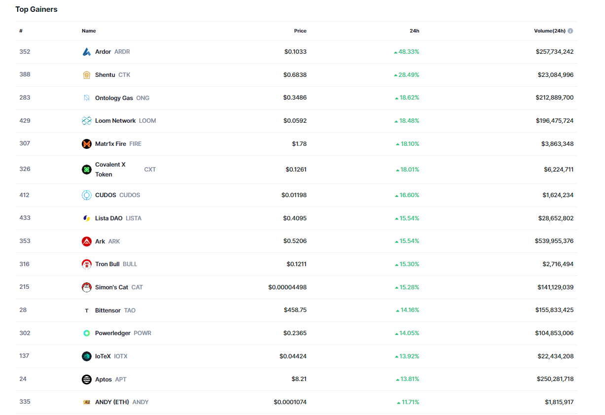 ARDR’nin yanı sıra CTK, ONG, LOOM, FIRE, CXT, CUDOS, LISTA, ARK, BULL ve CAT‘in de %15’den fazla yükseliş yaşadığı gözlemlendi.