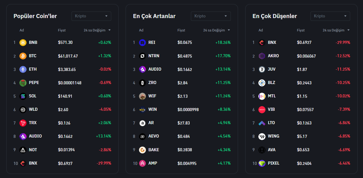 Hadi gelin bugün özelinde Binance’de listelenmiş altcoin‘lerin performanslarını birlikte inceleyelim: