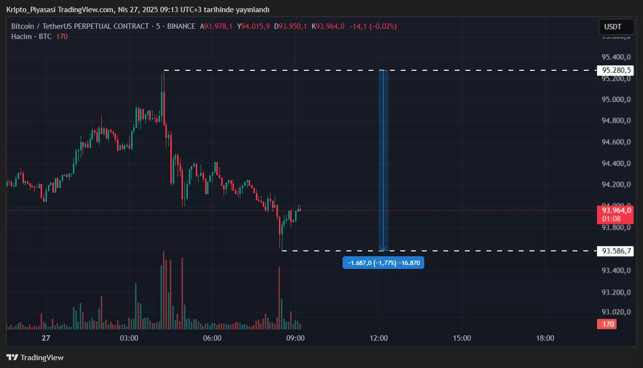 Bu yaşanan düşüş sonrasında 93.500 dolara kadar gerileyen BTC, an itibariyle ise 94 bin dolardan işlem görüyor. Bitcoin’in ilerleyen saatlerde daha büyük satış baskılarıyla karşılaması beklenebilir.
