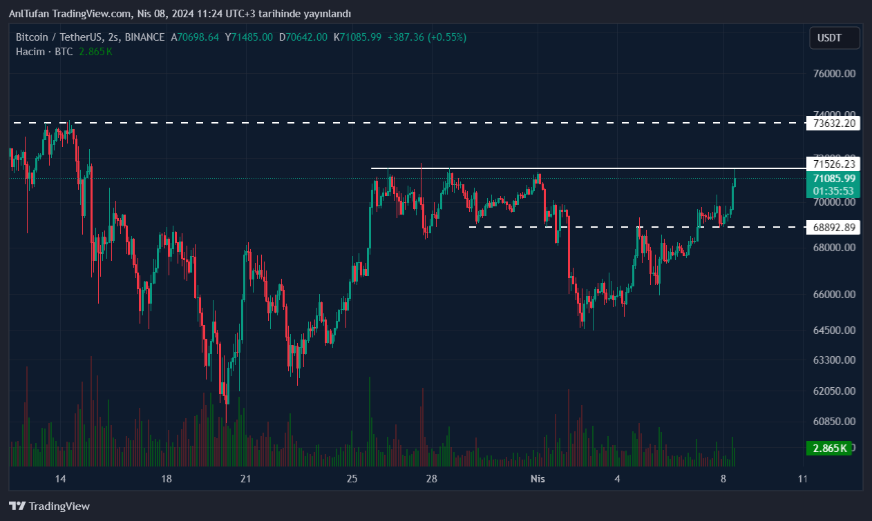 Bitcoin bu son yükselişleri ile birlikte 71.500 dolar seviyelerindeki direnç noktasına ulaşmayı başardı. Her ne kadar bu direnç çok güçlü olmasa da, ilk etapta BTC’nin reddedildiği gözlemlendi.