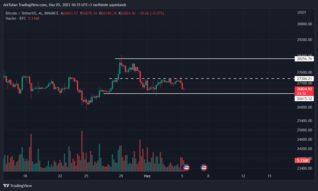 İlerleyen saatlerde lider kripto para birimi Bitcoin’in (BTC) 26.600 doların altına sarkmaması gerekiyor. Her ne kadar son düşüşler çok önemli olmasa da, 26.600 dolar desteğinin kırılması durumların çok kötüleşmesine neden olacaktır.