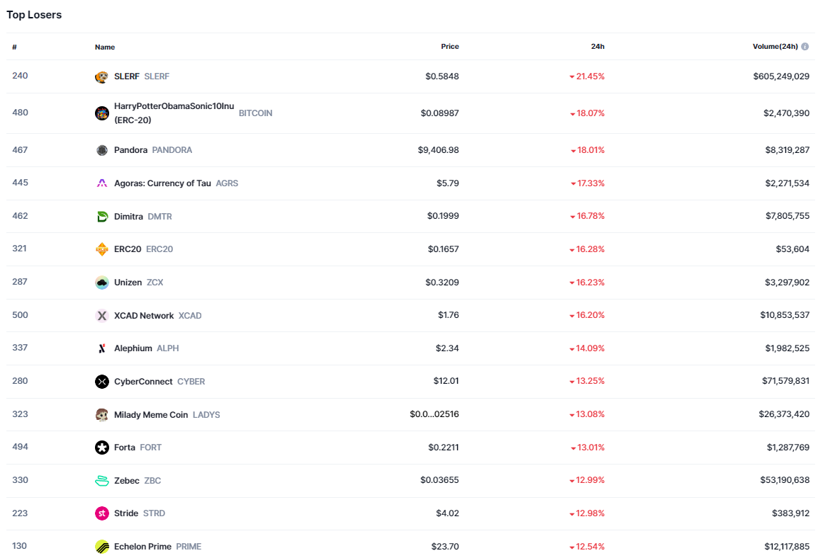 Başarılı bir veri sağlayıcısı olan CoinMarketCap’in aktardığı bilgilere göre ilk 500 kripto para birimi içerisinde son 24 saat özelinde en fazla düşüş yaşayan altcoin Slerf (SLERF) oldu.