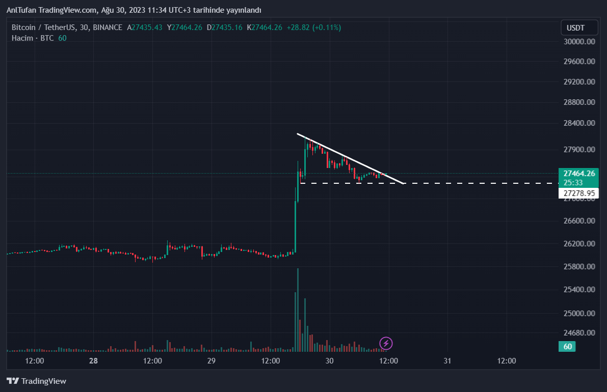Önümüzdeki saatlerde lider kripto para birimi Bitcoin’in (BTC) yükselişlerine devam edebilmesi için 27.550 dolardaki düşen trendini ve yatay direnci aşması gerekiyor.