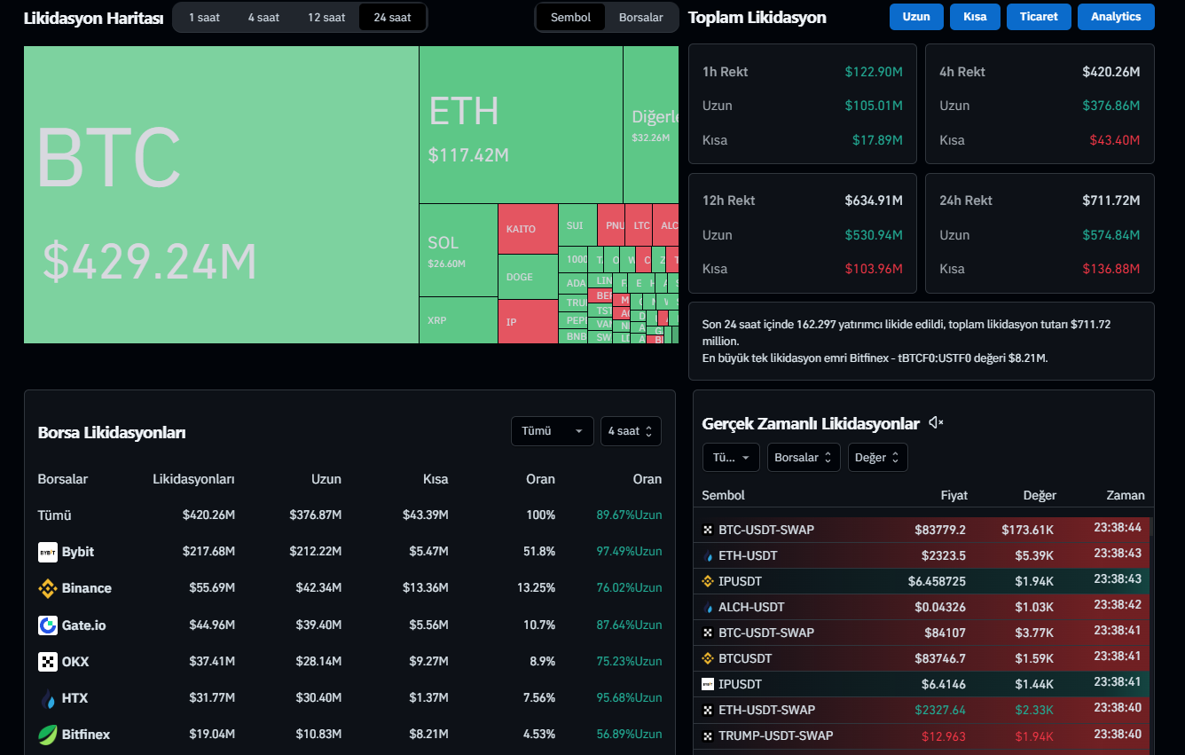 CoinGlass’a göre en büyük likidasyon 429 milyon dolar ile lider kripto para birimi Bitcoin’de (BTC) gerçekleşirken, sırasıyla ETH, SOL, XRP ve KAITO‘da da ciddi likidasyonların gerçekleştiği görülüyor.