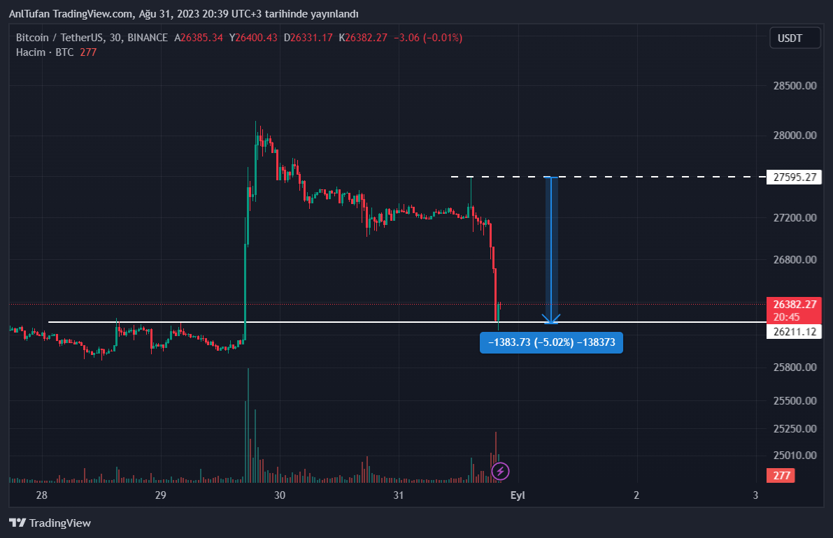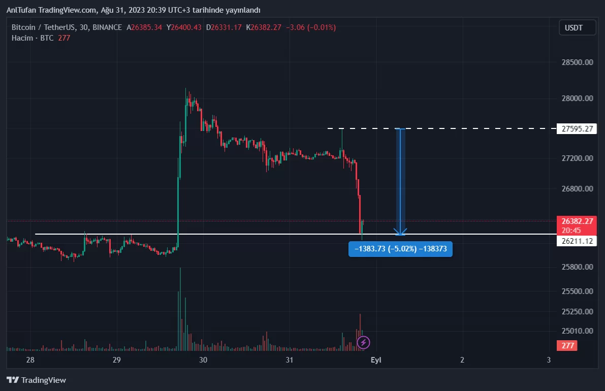 Lider kripto para birimi Bitcoin (BTC) son dakikalarda yine sert düşüşler yaşıyor. 27 bin dolar destek seviyesini kaybeden Bitcoin, çok kısa bir süre içerisinde 26.200 $ desteğine kadar yüzde 5’lik bir geri çekilme yaşadı.