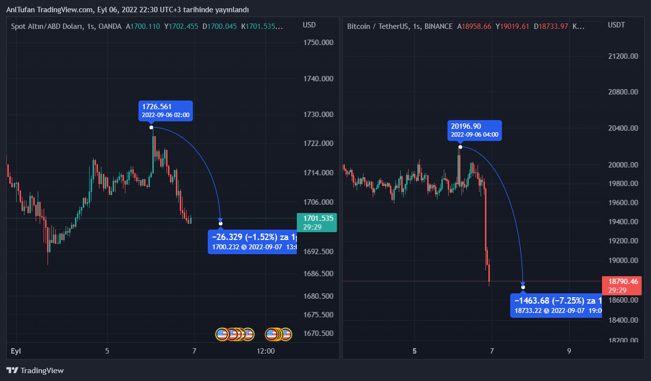 ABD dolar endeksinin (DXY) yükseliş yaşadığı esnada ONS altının ve lider kripto para birimi Bitcoin‘in sert bir şekilde düşüş yaşadığı görüldü. BTC‘de bu düşüşler yüzde 7’lere ulaşırken, ONS altının ise yüzde 2’ye yakın değer kaybetmesi dikkat çekiyor.