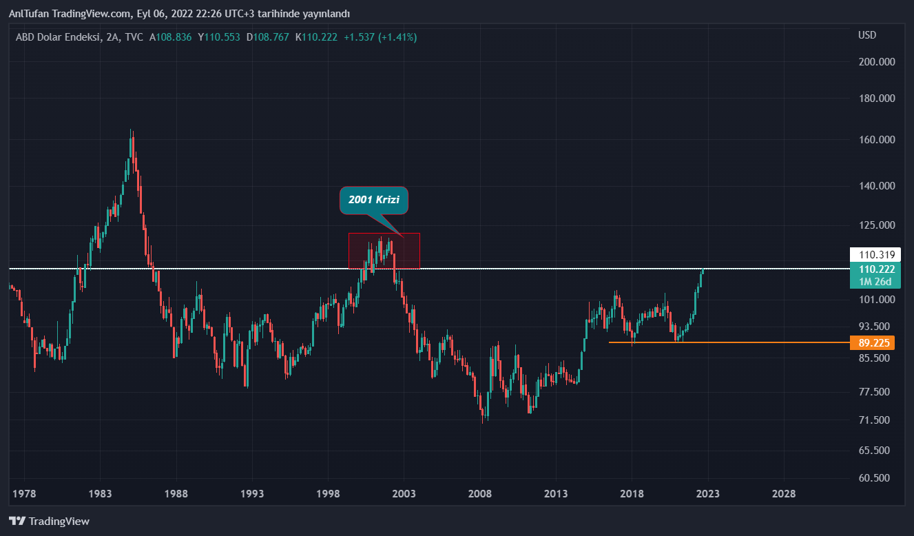2001 yılındaki krizi başlatan 110 dolar direncinin aşılması ise ABD dolar endeksinin sert bir şekilde yükselerek küresel çapta yeni büyük bir ekonomik krizi daha tetikleyebilir.